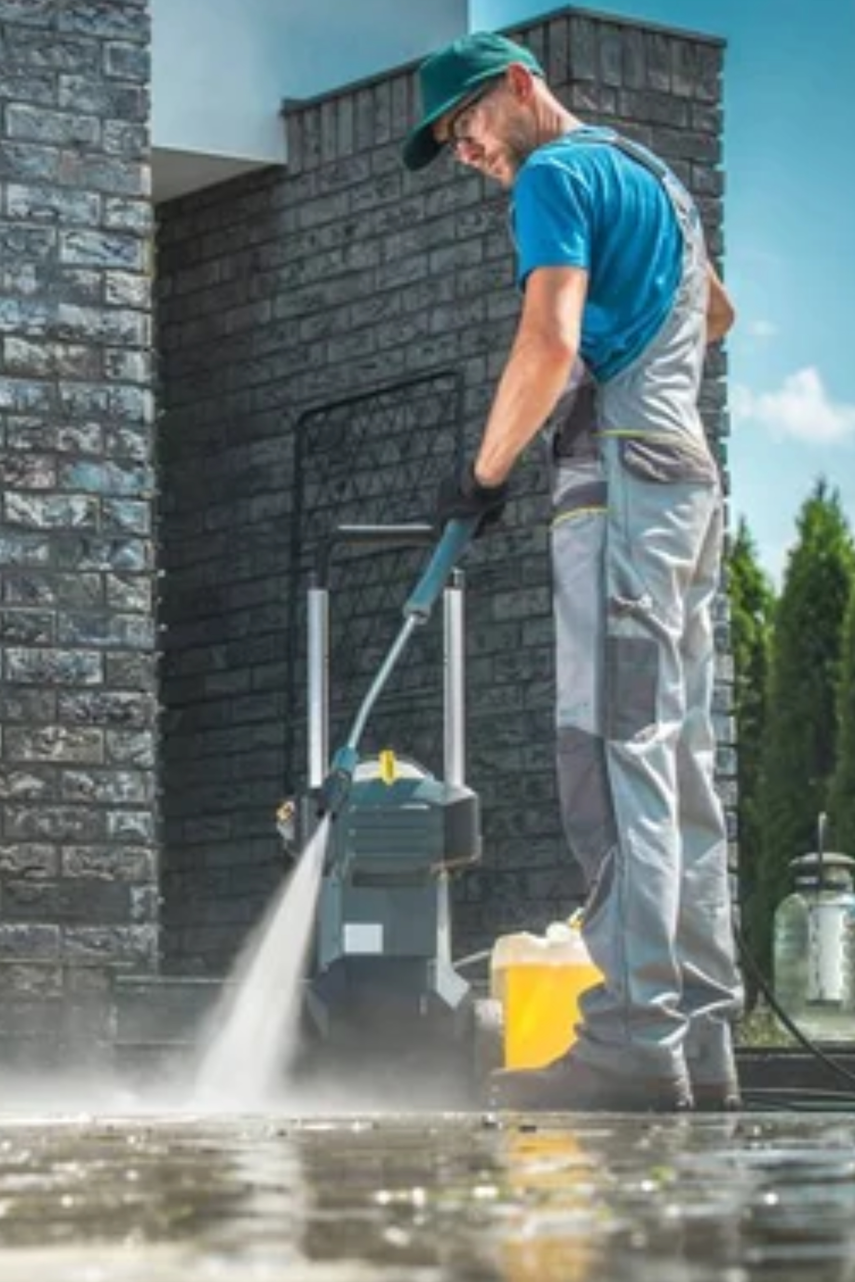 When it comes to pressure cleaning large outdoor areas, we recommend getting a professional in to do the job correctly with a petrol washer.